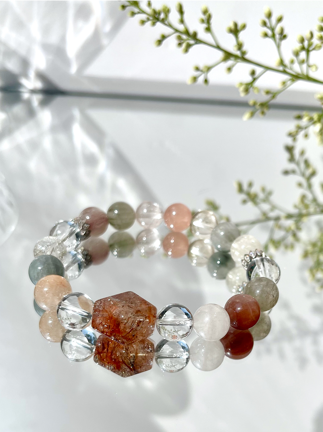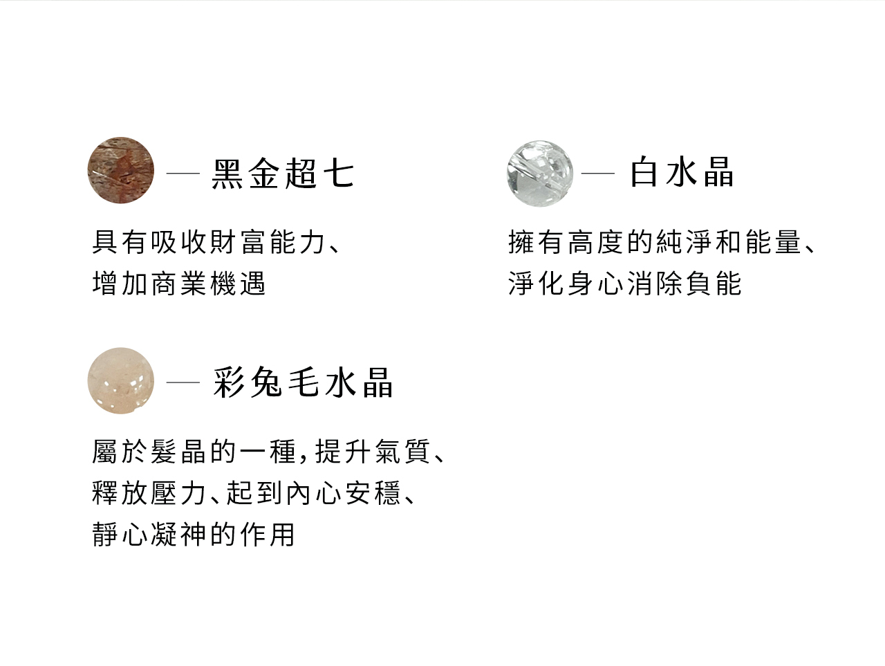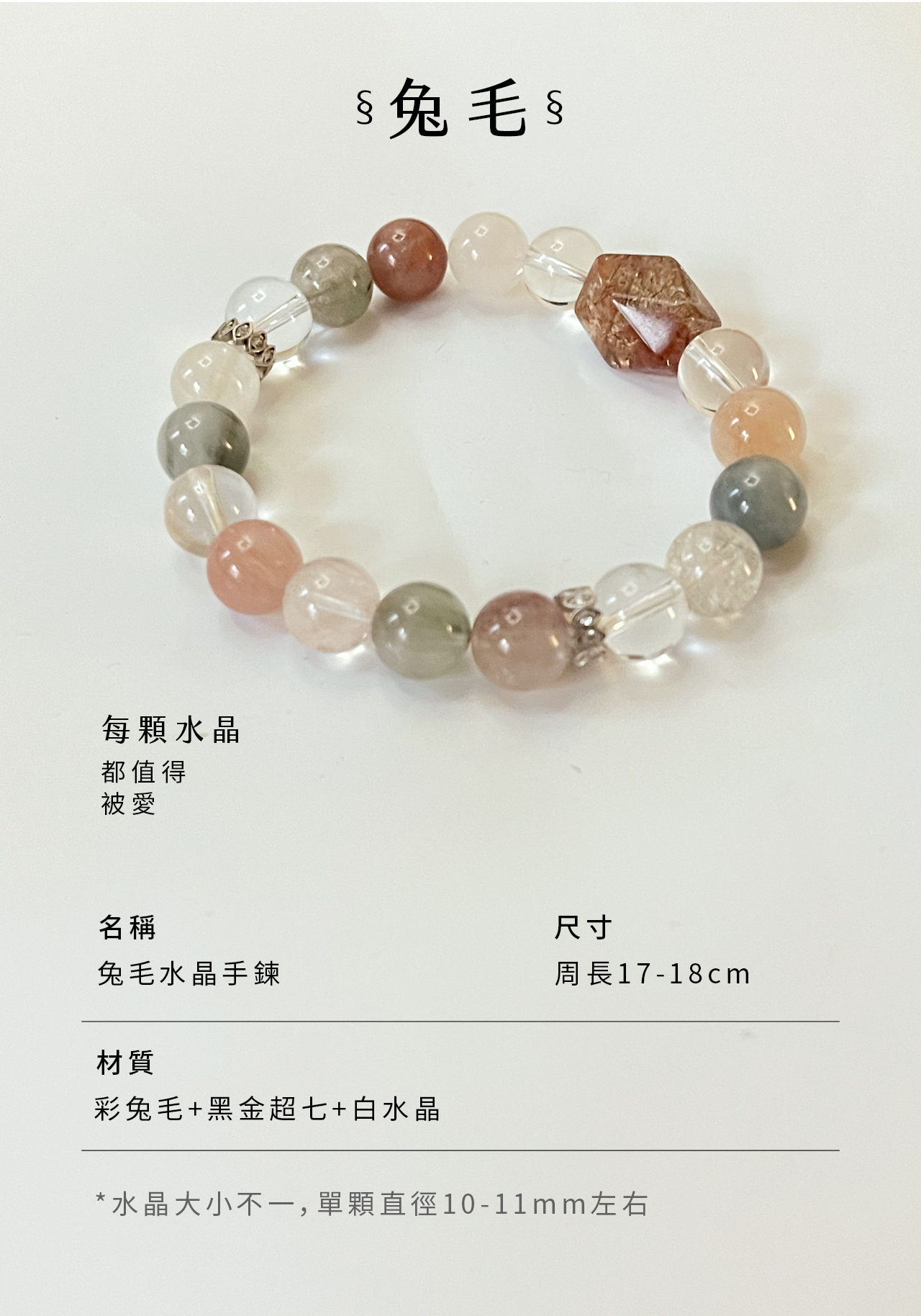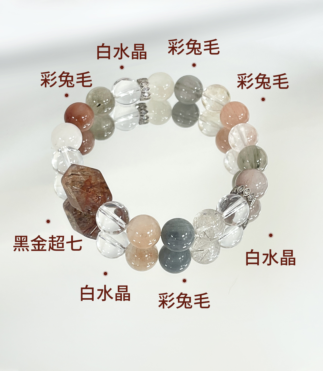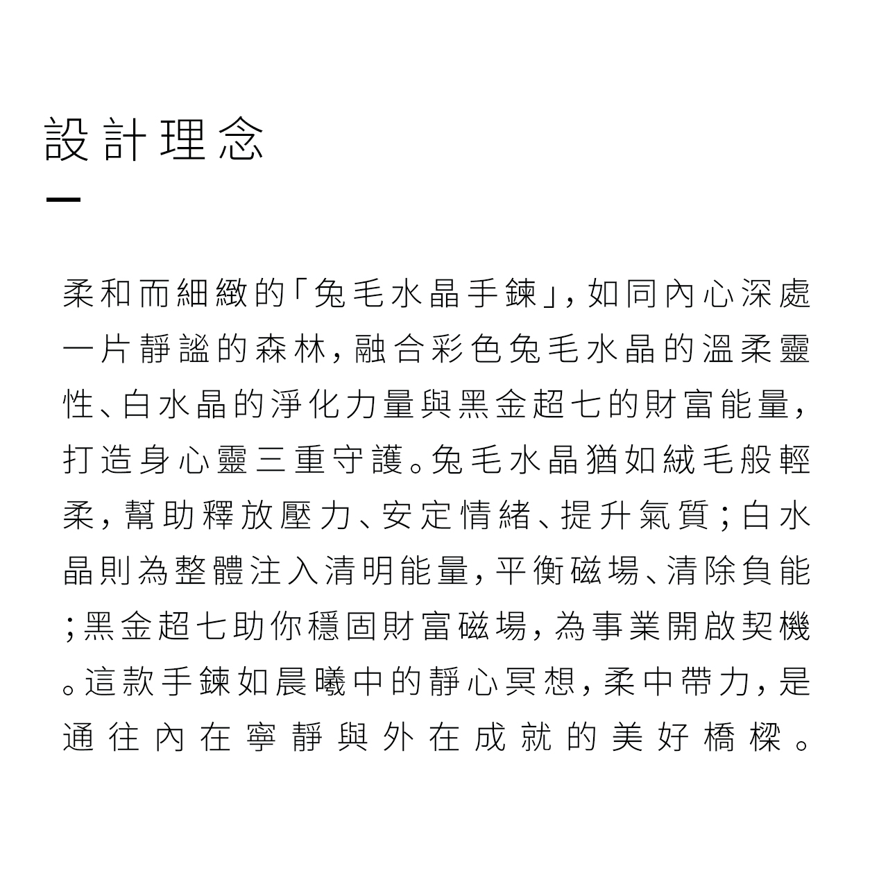 柔和而細緻的「兔毛水晶手鍊」,如同內心深處一片靜謐的森林,融合彩色兔毛水晶的溫柔靈性、白水晶的淨化力量與黑金超七的財富能量,打造身心靈三重守護。兔毛水晶猶如絨毛般輕柔,幫助釋放壓力、安定情緒、提升氣質;白水晶則為整體注入清明能量,平衡磁場、清除負能;黑金超七助你穩固財富磁場,為事業開啟契機。這款手鍊如晨曦中的靜心冥想,柔中帶力,是通往內在寧靜與外在成就的美好橋樑。